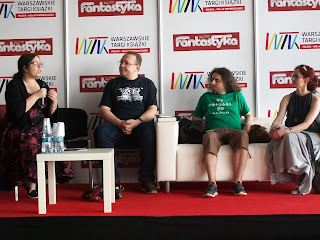 Druga prelekcja była po drugiej stronie galerii. Ewa Białołęcka, Aneta Jadowska, Aleksandra Zielińska, Agnieszka Hałas i Marta Kisiel-Małecka opowiadały o swojej Hardej Hordzie. Czyli o polskiej grupie kobiet pisarzy, które się wreszcie zorganizowały, by walczyć z męską opresją. :) I jasne - szowinizm na rynku wydawniczej fantastyki to oczywista, oczywistość. Ale trochę rozczarowujące jest gdy kolejny raz słyszę, że wydawcy mówią autorkom, że ich proza jest dla kobiet, że mężczyźni tego nie kupią. To już jest stary dowcip. Fajnie, że wreszcie pisarki się zorganizowały i zaczną zmieniać rzeczywistość własnymi siłami. Tylko może jakieś nowe anegdotki, przy narzekaniu na świat patriarchatu. :)