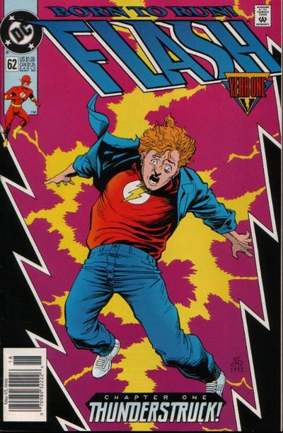 W miarę lektury mina mi się jednak wydłużała. Okazało się, że Waid z 1992 to nie ten sam człowiek co w roku 2000. Chyba przez te 8 lat pracy przy Flashu wyrabiał się stopniowo. Albo może ten run był dobry już na początku - nie wiem, bo jeszcze nie czytałem. Ale nie mogę tego powiedzieć o pierwszych 4 zeszytach które opowiedziały nam powstanie Kid Flasha. Ten origin jest strasznie typowy, naiwny i nudny. Popełnia wszystkie błędy narracyjne z jakich śmiano się w Złotej i Srebrnej Erze. Zresztą wystarczy popatrzeć do archiwalnego zeszytu na końcu albumu. Miejscami jest on nawet ciekawszy niż główna historia. Wally West wspomina gdy jako 10-latek przyjechał do Central City na wakacje, do swojej ciotki Iris West. Zaraz przy dworcu uratował życie Flashowi (!) i ten postanowił poznać go lepiej, odwiedzając go w mieszkaniu Barrego Alena. Podczas ich rozmowy jeszcze raz piorun wpada przez okno i niszcząc szafkę oblewa Wallego tymi samymi chemikaliami (!!), które kiedyś dały Barremu jego moce. A potem mamy typową naukę tego jak być superbohaterem. Wally dostał nawet dokładnie taki sam czerwony kostium jak jego mentor. Na dodatek musiał on złożyć przysięgę, że nigdy nie użyje swoich mocy w złym celu.